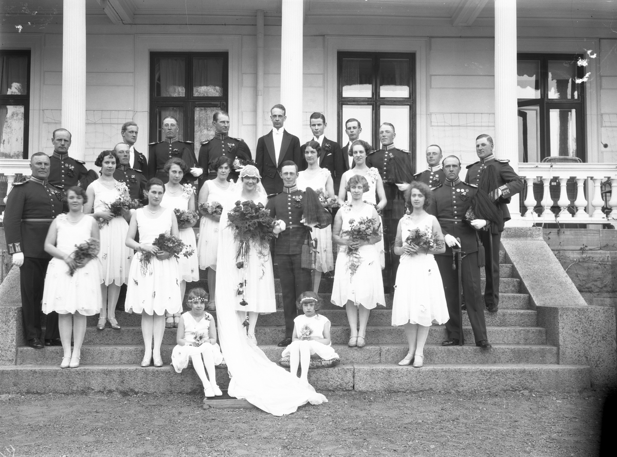Brudparet Grundell med släkt och vänner på trappan till Engeltofta