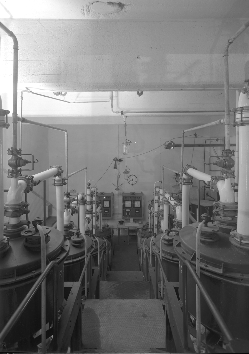 Titel: Koldioxinanläggningen, koldioxid användes vid blekning av sulfatmassa. Den 18 juli 1953. Korsnäs AB är ett av Sveriges ledande skogsindustriföretag som tillverkar kartong, säck- och kraftpapper, fluffmassa till hygienprodukter och sågade trävaror.