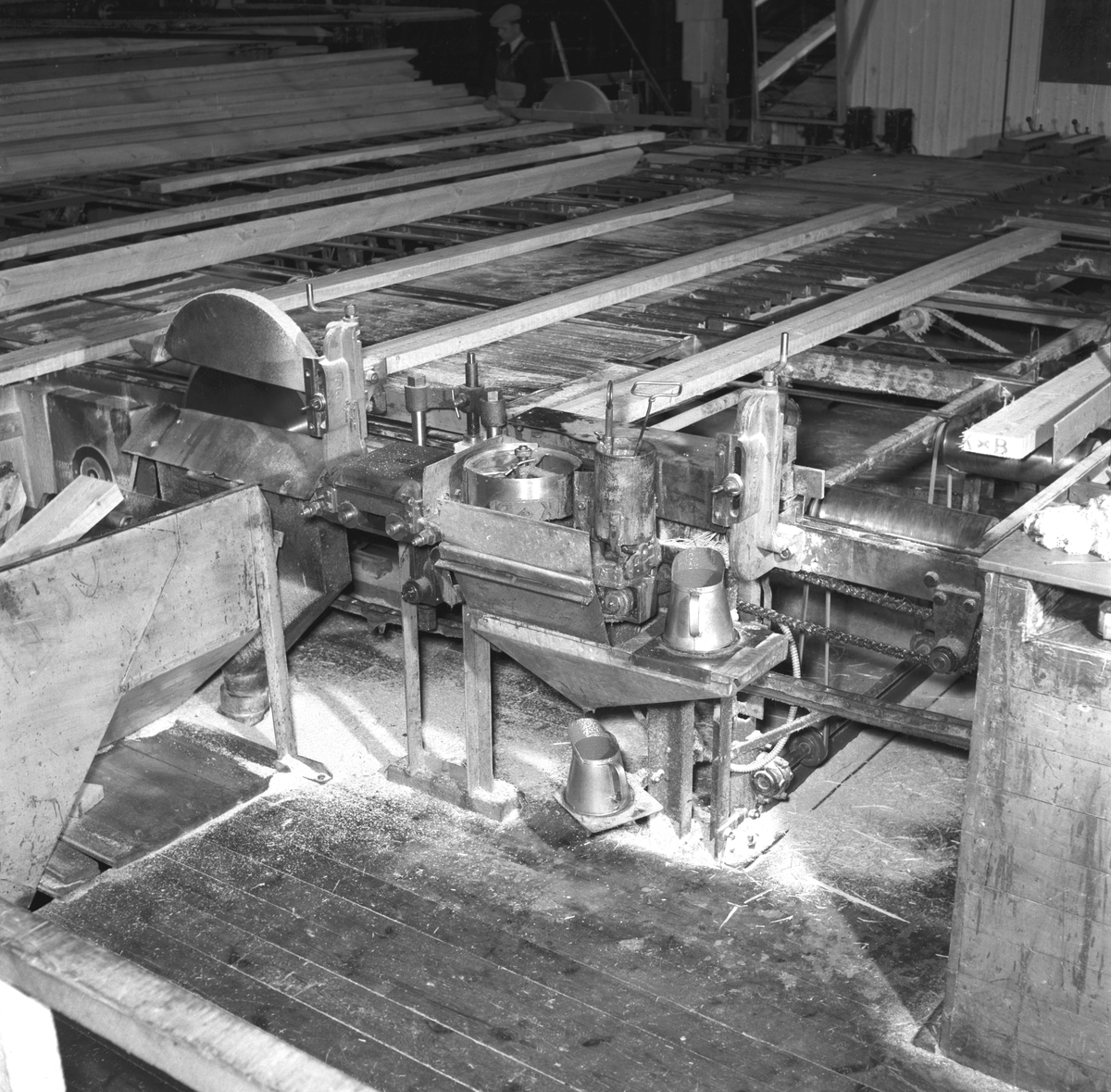 Sågverket. Korsnäs AB April 1955. I virkessorteringen sorteras, märkes och mätes virket.