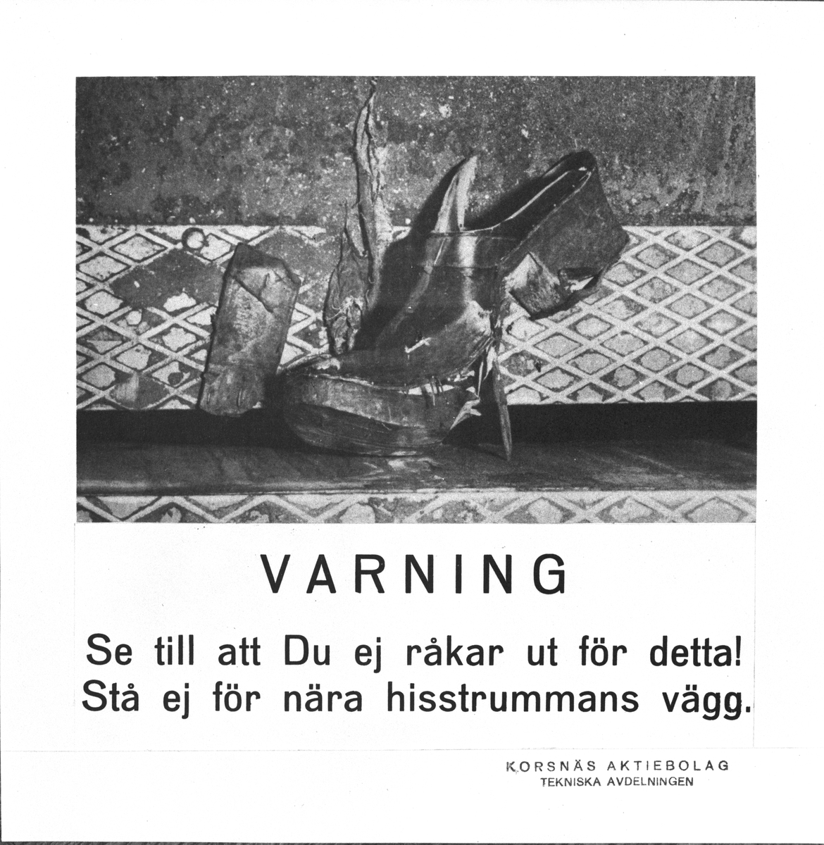 "VARNING. Se till att Du ej råkar ut för detta! Stå ej nära hisstrummans vägg". Korsnäs Aktiebolag, Tekniska kontoret. Den 2 mars 1957.