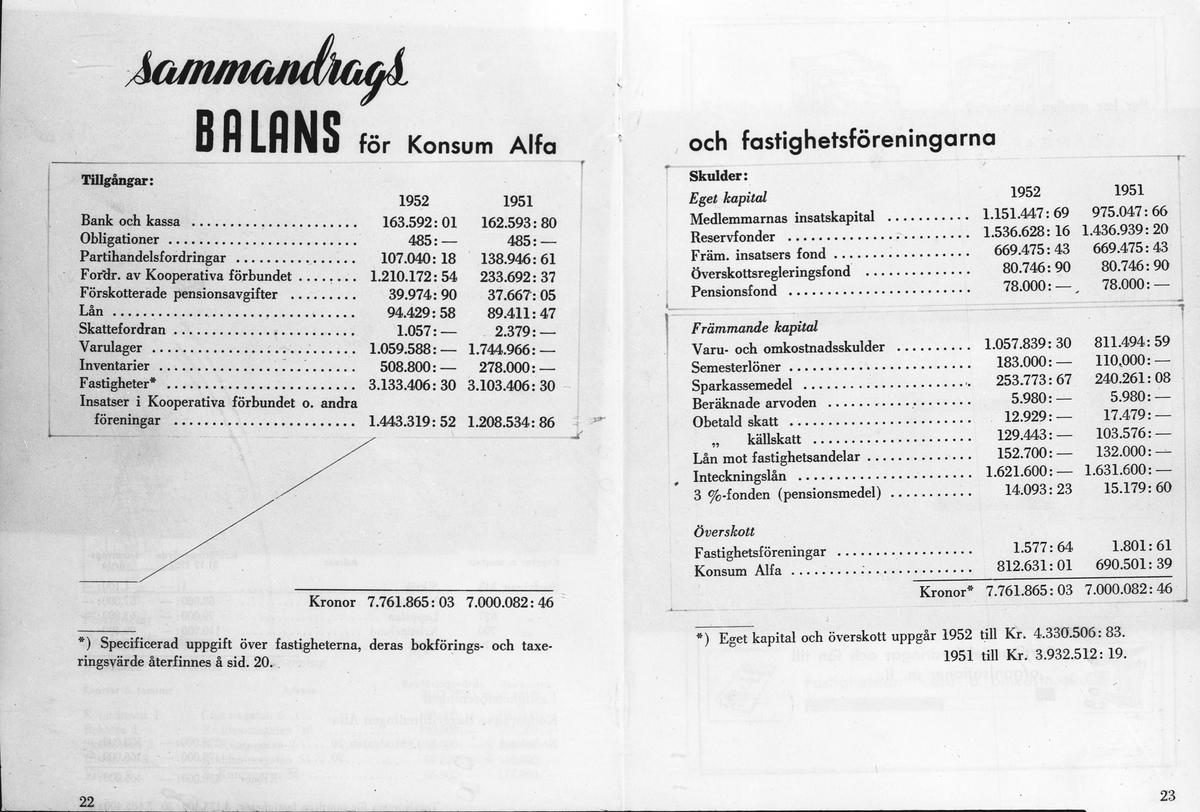 Konsum Alfa, sammandrag balans för Konsum Alfa, mars 1953
