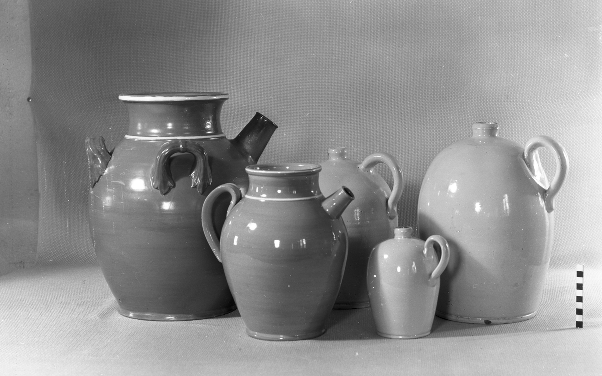 Husgeråd. Sirapskanna och Brännvinskrus. Bobergs Fajansfabrik AB.