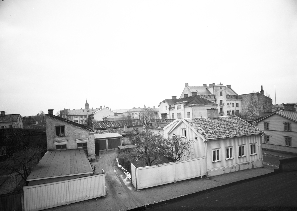 Utsikt från Södra Slottsgatan mot kvarteret Styckjunkaren. 15 december 1954