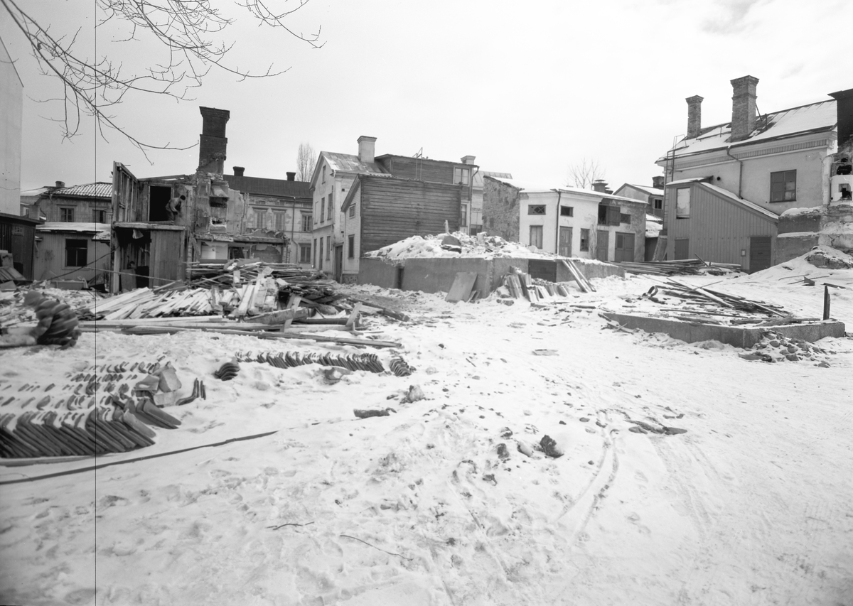 Kvarteret Hantverkaren under rivning, Lotsgränd, Timmermansgatan, Timmermansgränd och Södra Kungsgatan. 7 mars 1955
