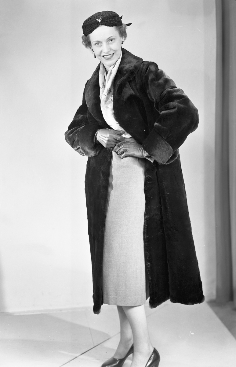 Pälskappa och hatt. L. Haglund & Co, med varumärket Elhå. Grundades som en affär för mössor, hattar och pälsvaror av Lars Haglund 1872.