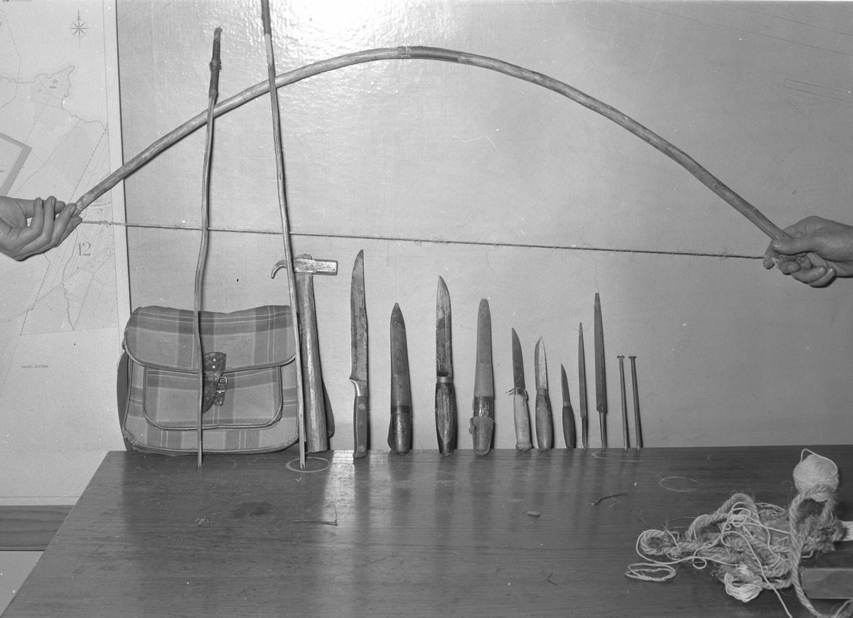 Polisstation. Visning av diverse tillhyggen såsom pilbågar, knivar, hammare m.m. 15 april 1953.