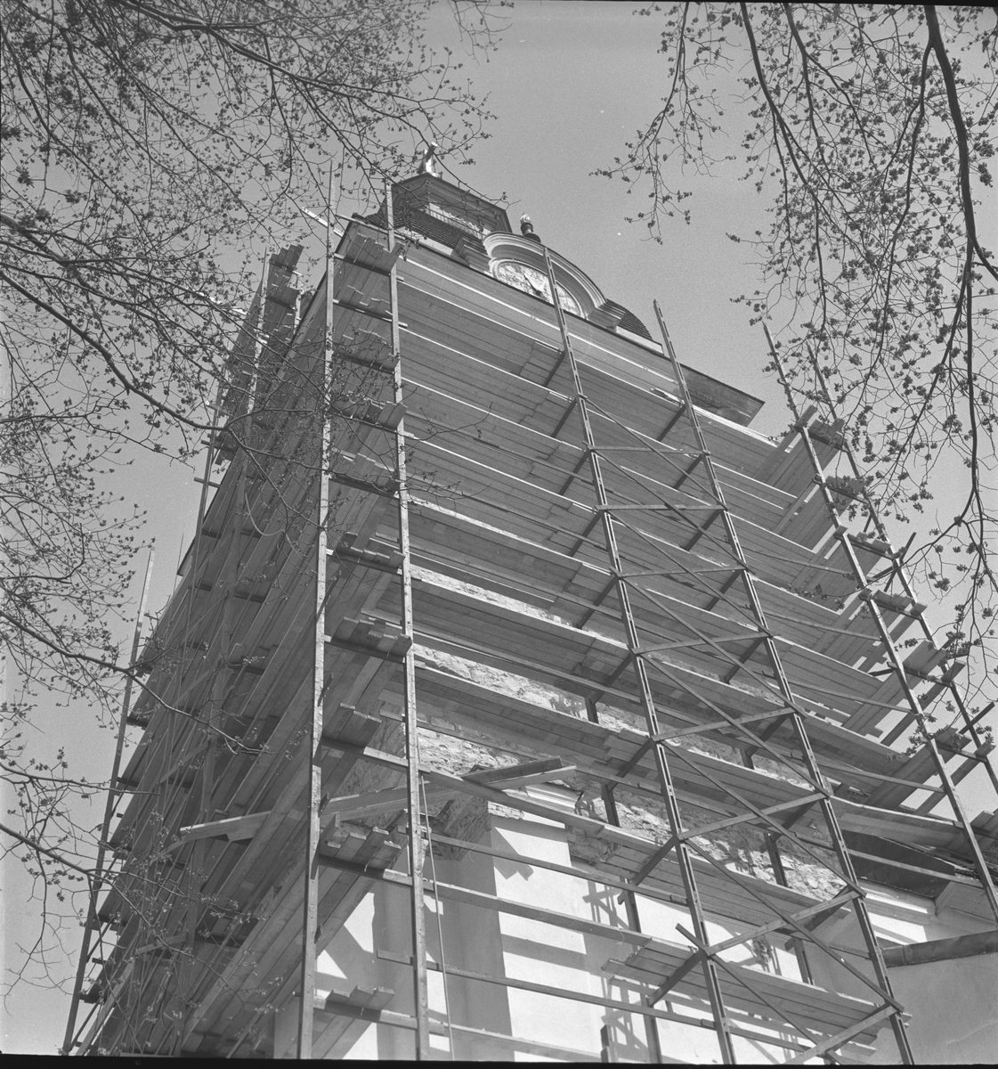 Gävle Heliga Trefaldighets Kyrka. Kyrktornet restaureras. 9 maj 1953.