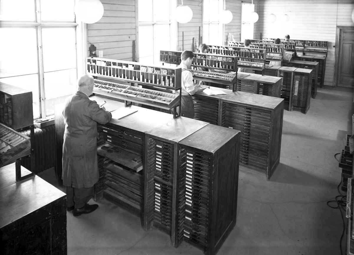 Interiör från Gävleborgs Tryckeri AB. September 1945. Firma Eric Dahlberg, Stockholm.