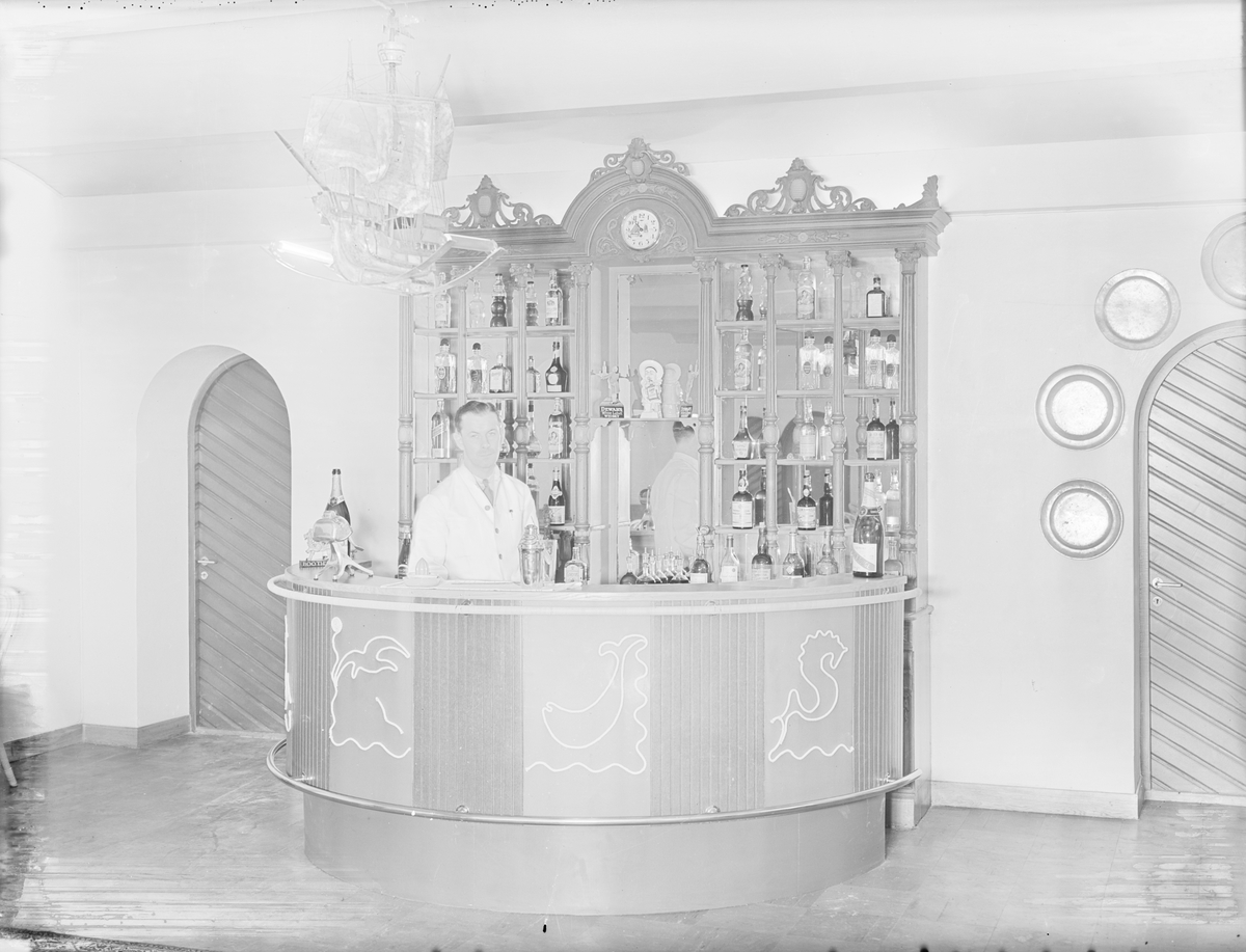 Interiör av " Gyllene Skeppet", Direktör Zedrén står vid bardisken på Skeppet.