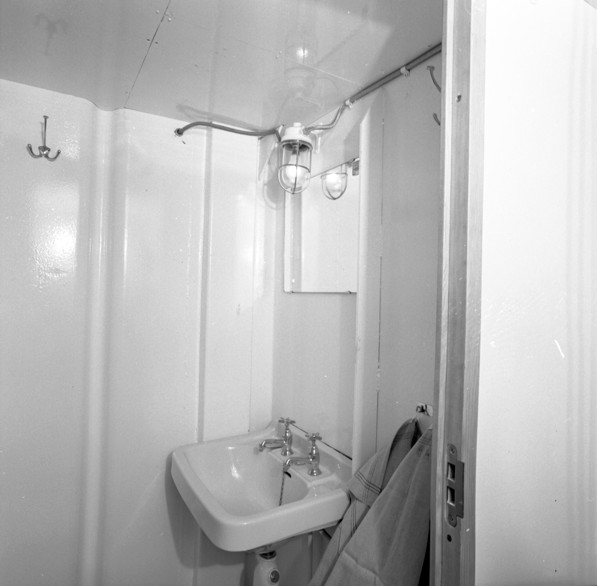Fartygsleverans, den 12 juni 1965 på Gävle Varv. M/S Fauna, toalettinteriör. Troligtvis levererades fartyget från Gävle till Mariehamn på Åland.