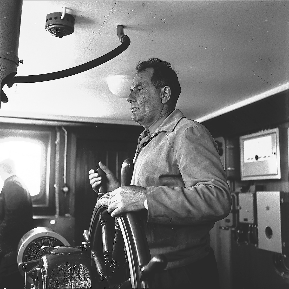 Fartygsleverans av M/S Fauna, den 12 juni 1965 på Gävle Varv. Troligtvis levererades fartyget från Gävle till Mariehamn på Åland. Styrman på plats på kommandobryggan.