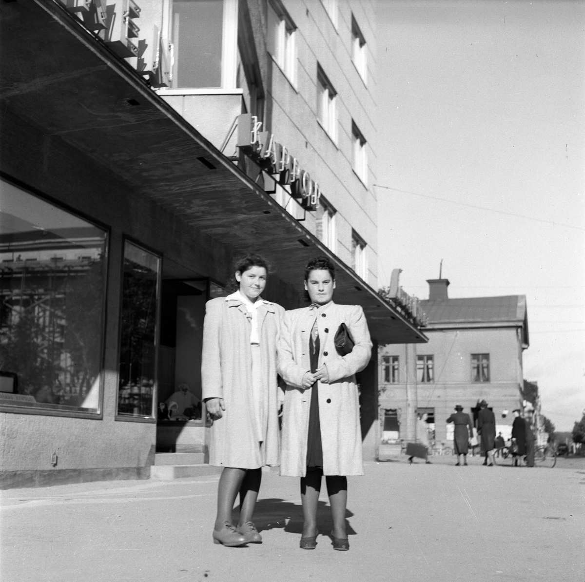 Kvinnor från Polen på besök i Katolska kyrkan. Står utanför Elkompaniet i Gävle. September 1945.