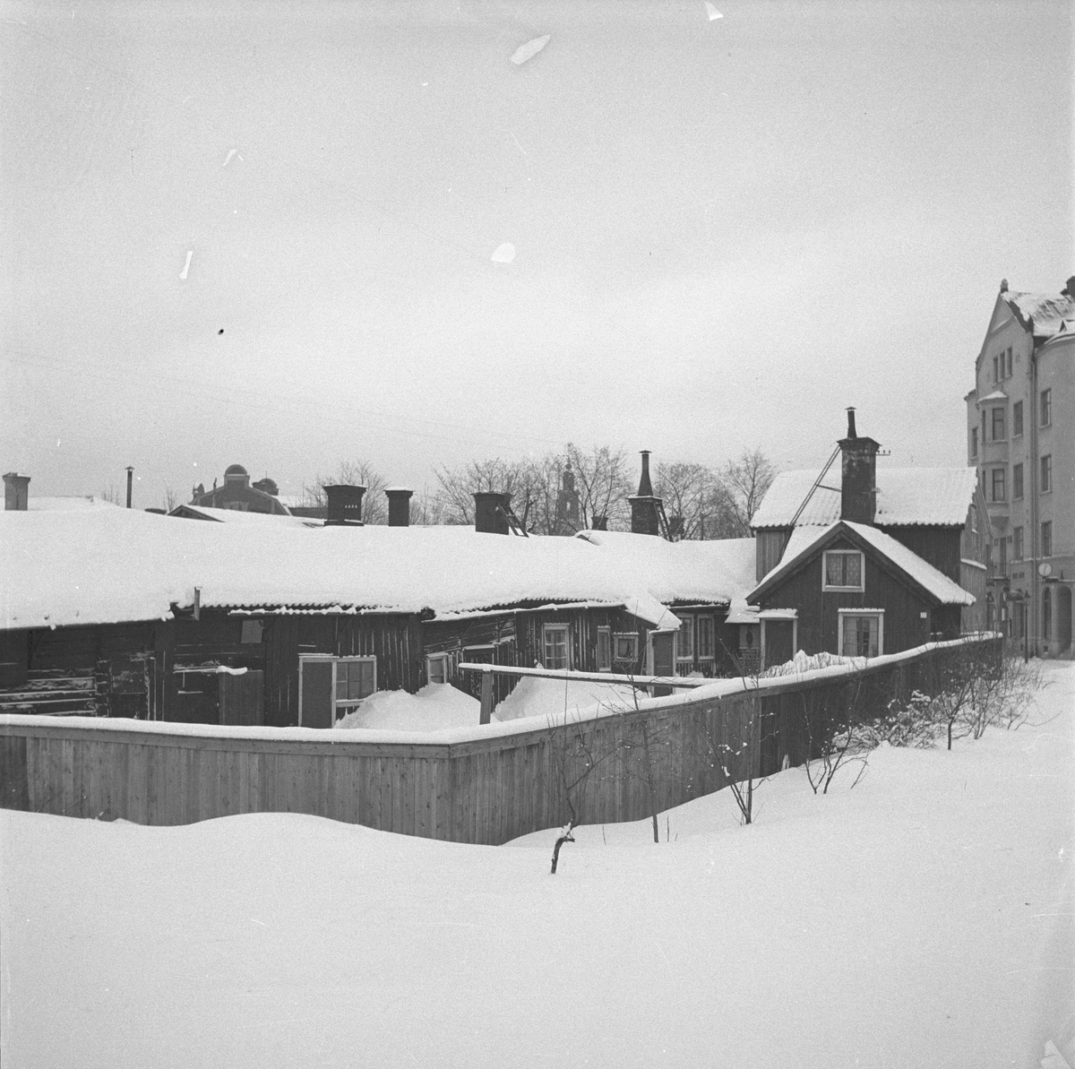 Snösvängen i Gävle i kvarteret Springer med adress Brynäsgatan 3 till höger.