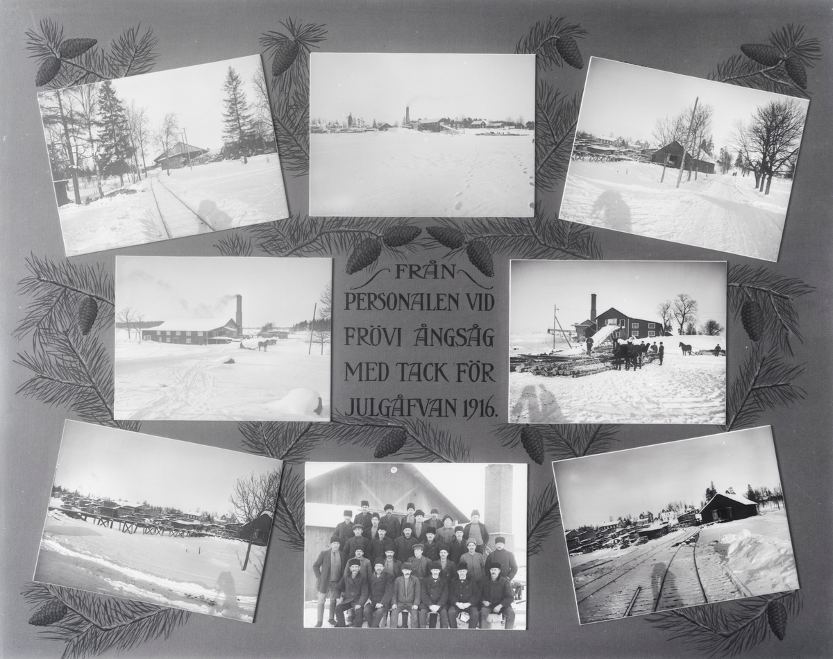 Till Faktor E. Bergström, Frövi Ångsåg. Kollage, tackkort från personalen vid Frövi Ångsåg med tack för julgåvan 1916.