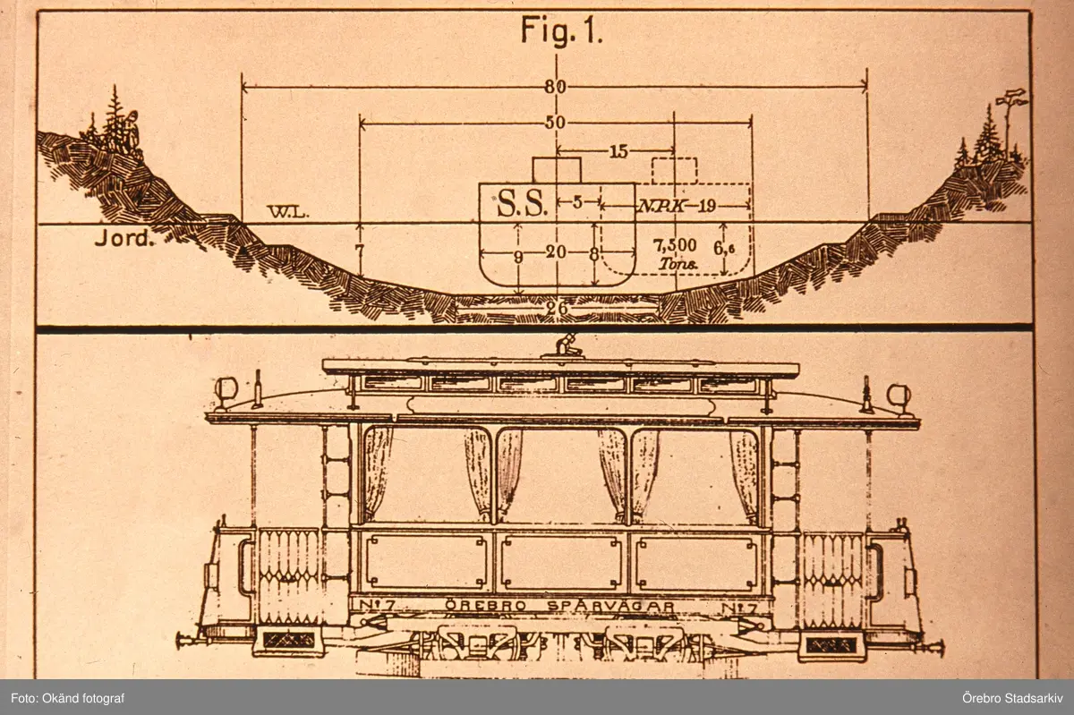 Ritning till spårvagn för tilltänkt spår i Örebro, 1917