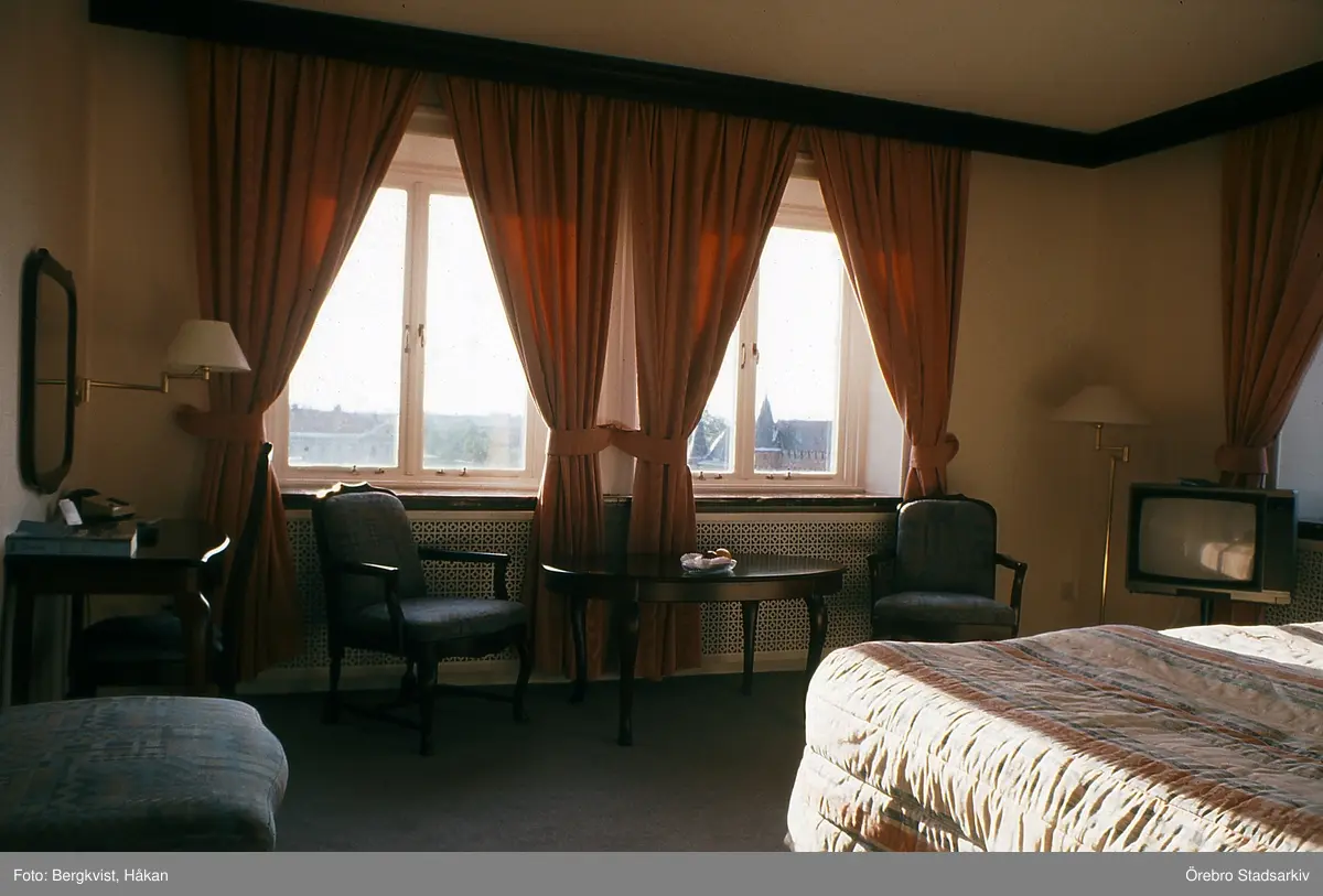 Hotellrum i Örebro med fönster mot Allehandaborgen, 1989