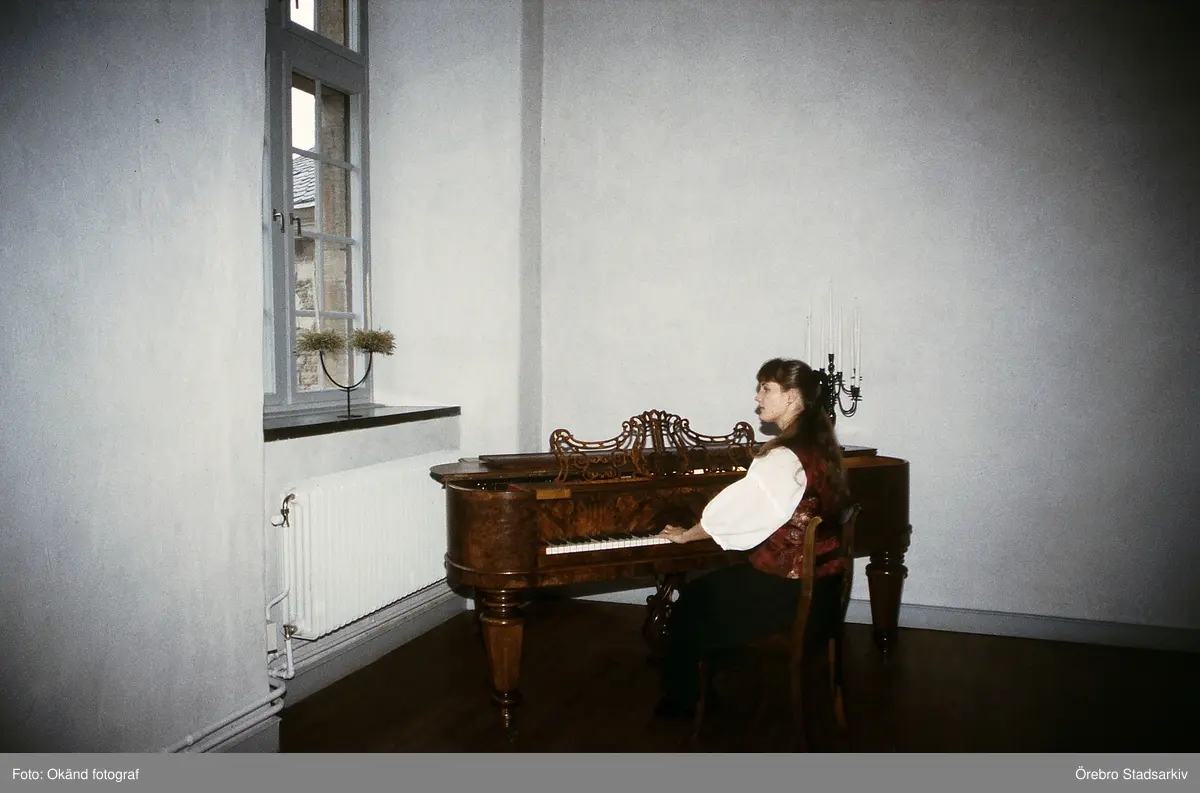 Slottsguide Christel Wedhäll spelar piano på Örebro slott, 1985