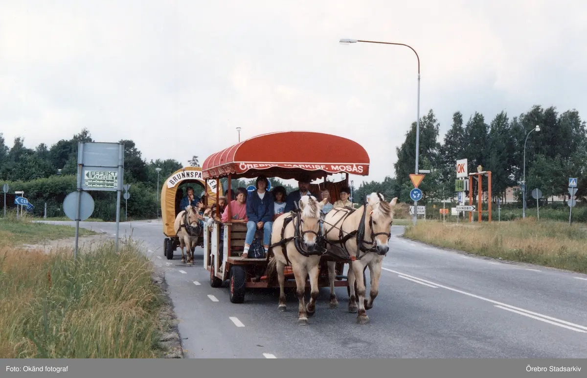 Häst och vagn körs mot stan från Lundby och Vivalla, 1980-tal