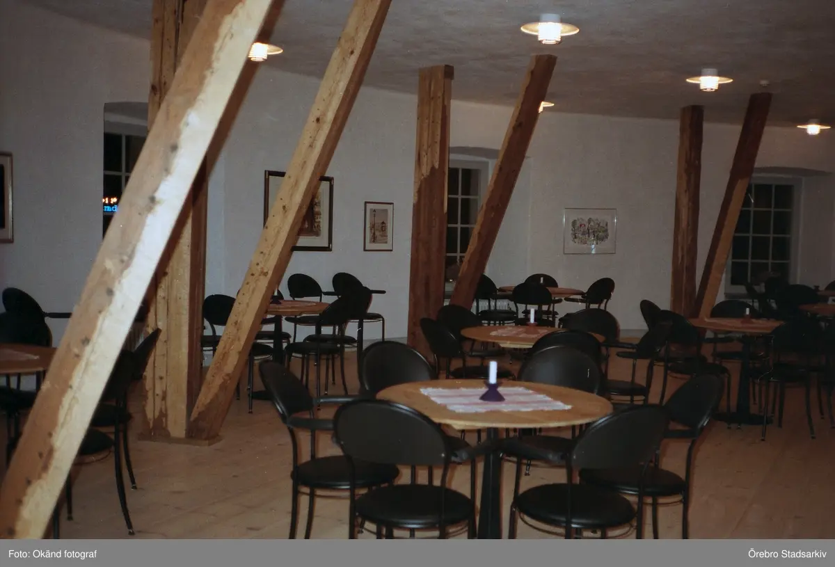 Cafémöblering under frilagda takstolar i Örebro slott efter nybyggnad, 1985