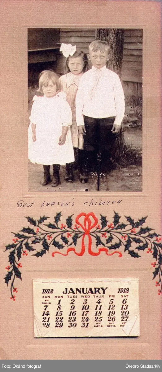 Tre av Gustaf Larssons barn på almanacka, 1912