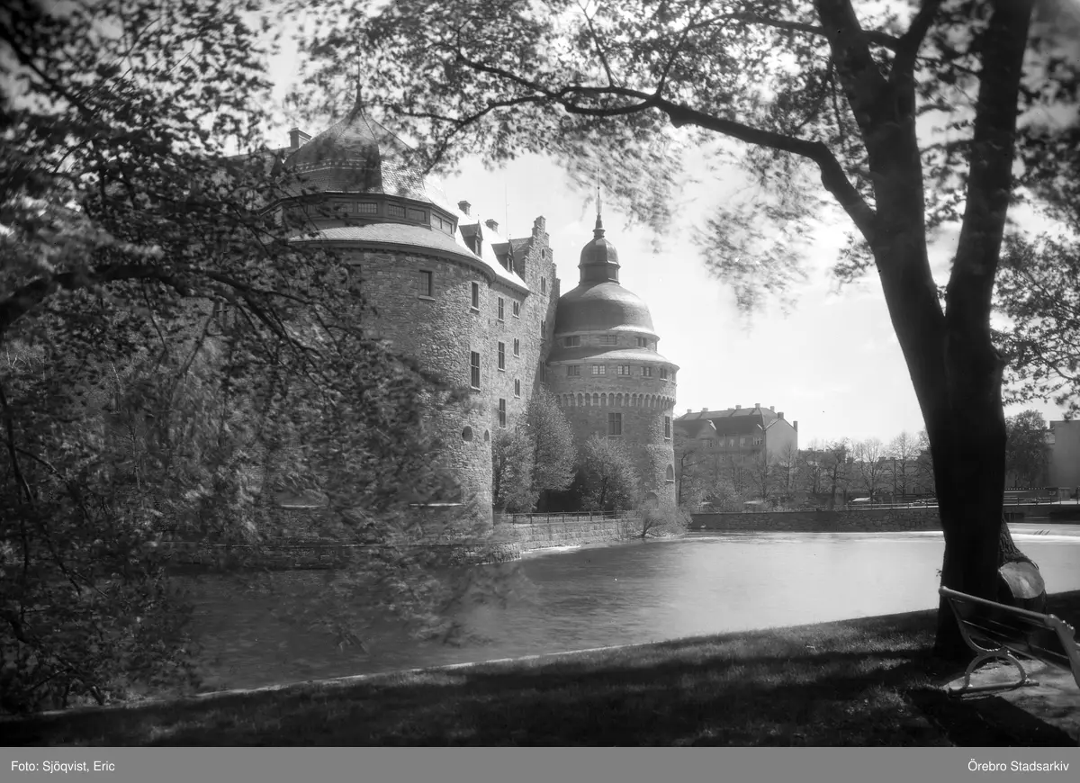Örebro slott sett genom trädgrenar i centralparken, 1930-tal