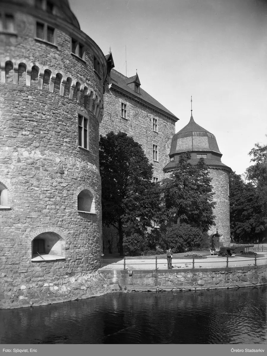 Man står vid kanonerna vid Örebro slott, sett från kvarnbron, 1930-tal