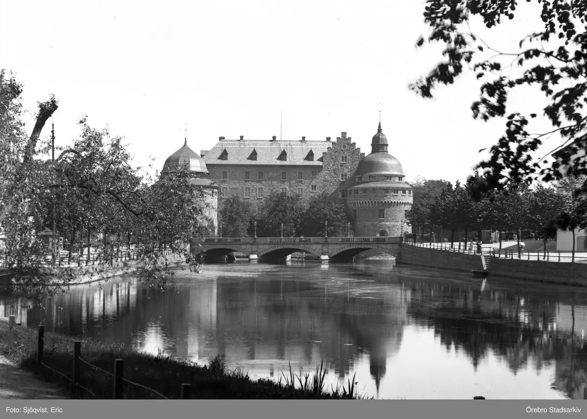 Örebro slott bakom storbron sett från Frimurareholmen, 1930-tal