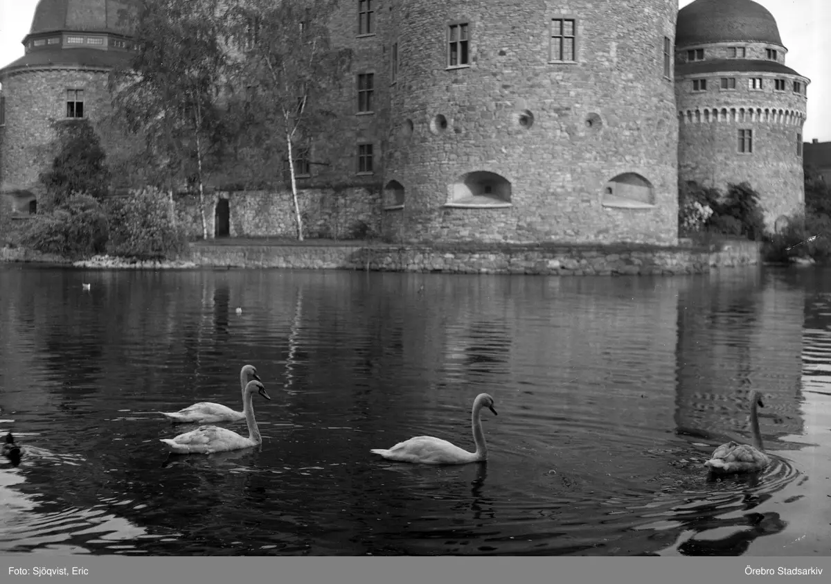 Svanar simmar åt öster i Svartån framför Örebro slott, 1930-tal