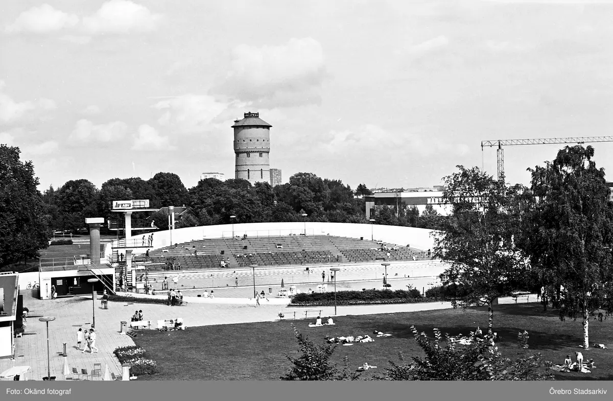 Vy över Gustavsviksbadet mot södra vattentornet, 1985