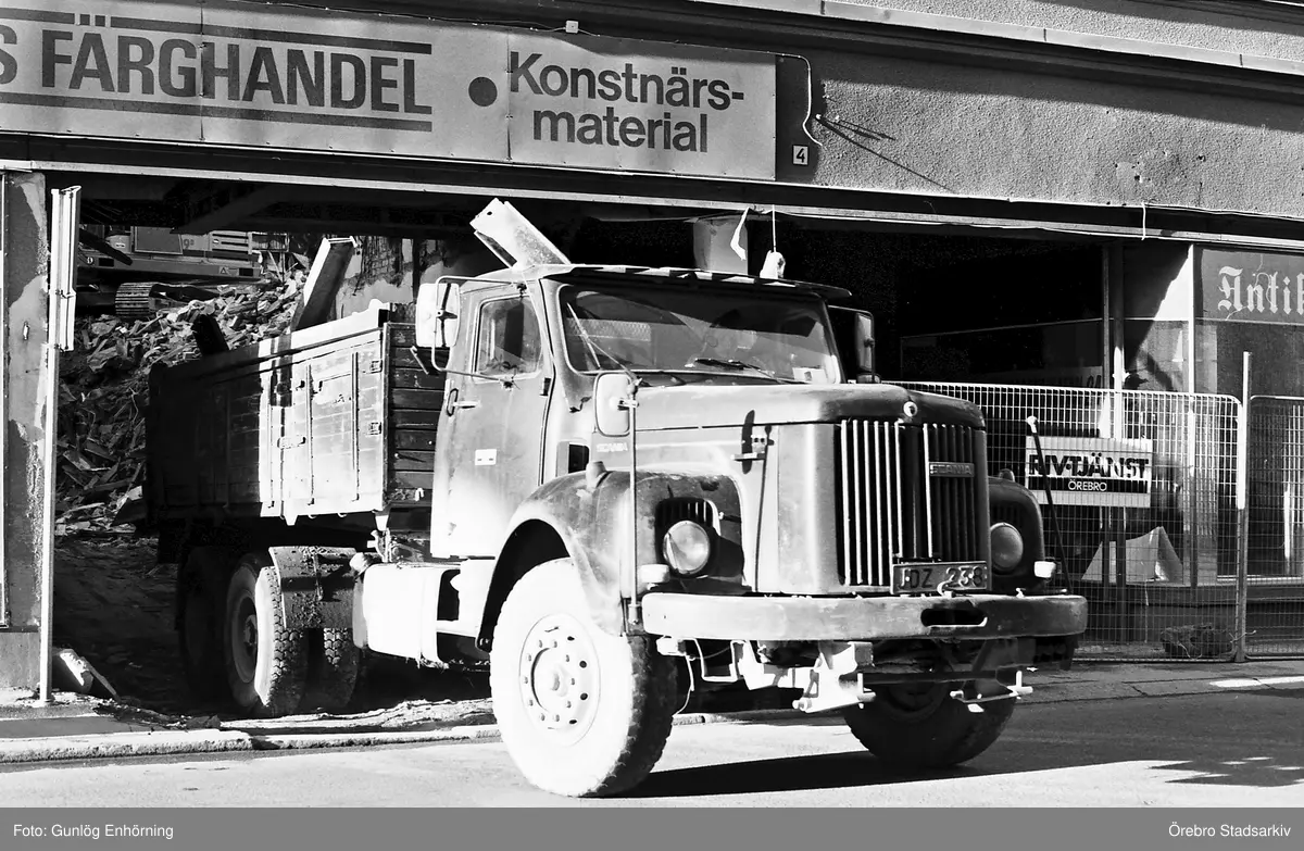 Lastbilen lämnar fastigheten Köpmangatan 4 med rivningsmassa, 1985