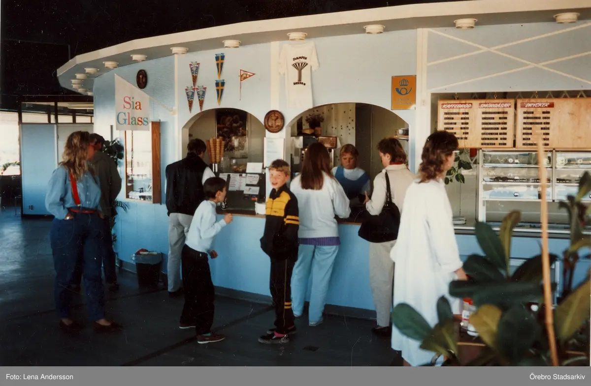 Besökare i kö vid serveringen på vattentornet Svampen, 1990