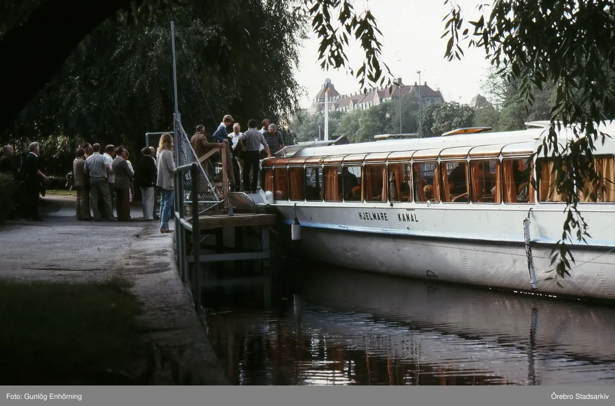 Passagerare stiger ombord på turistbåten Hjelmare kanal vid Hamnplan, 1975-1980