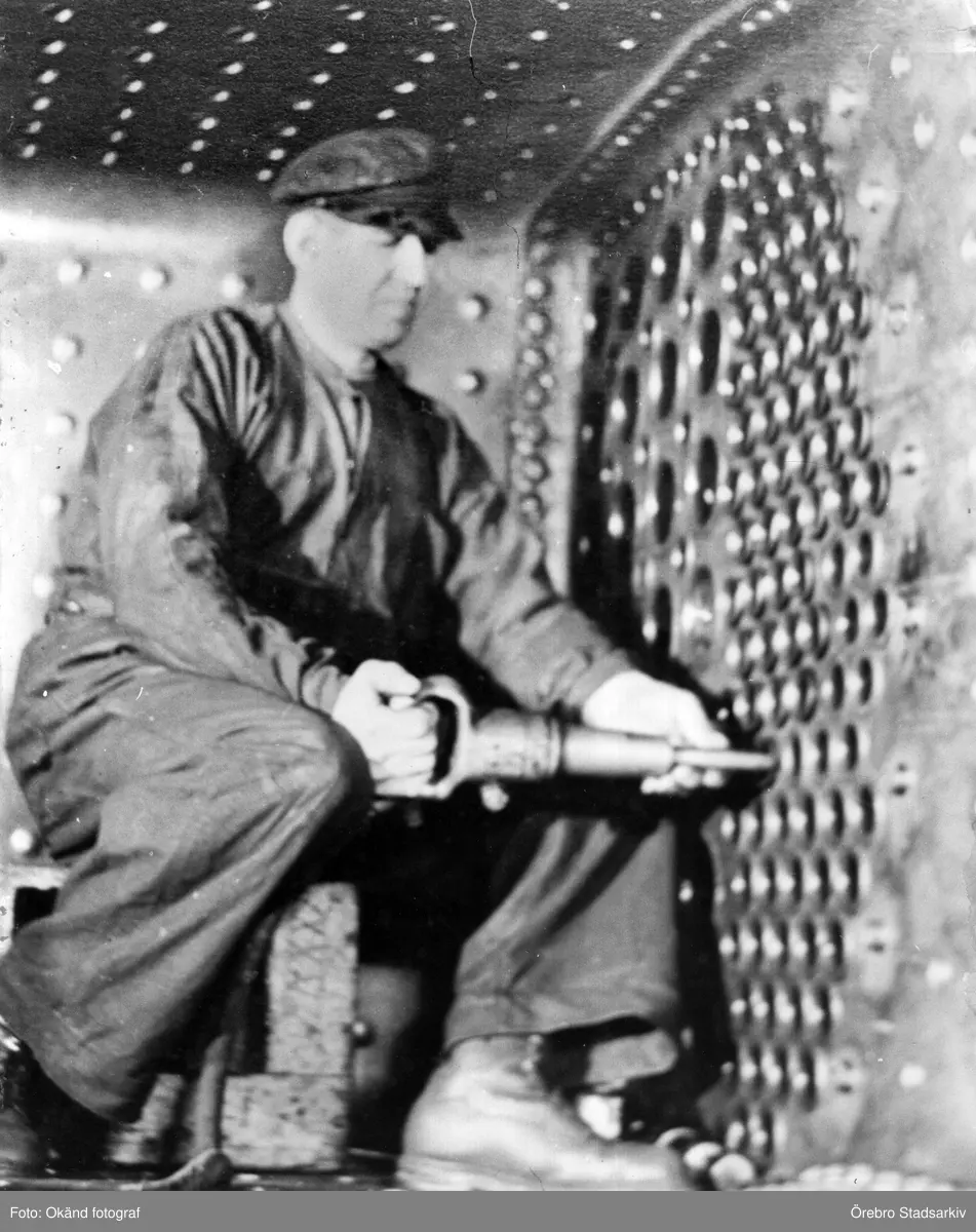 Pannsplåtslagare Oskar Zetterberg diktartuber efter pressning, 1950-tal