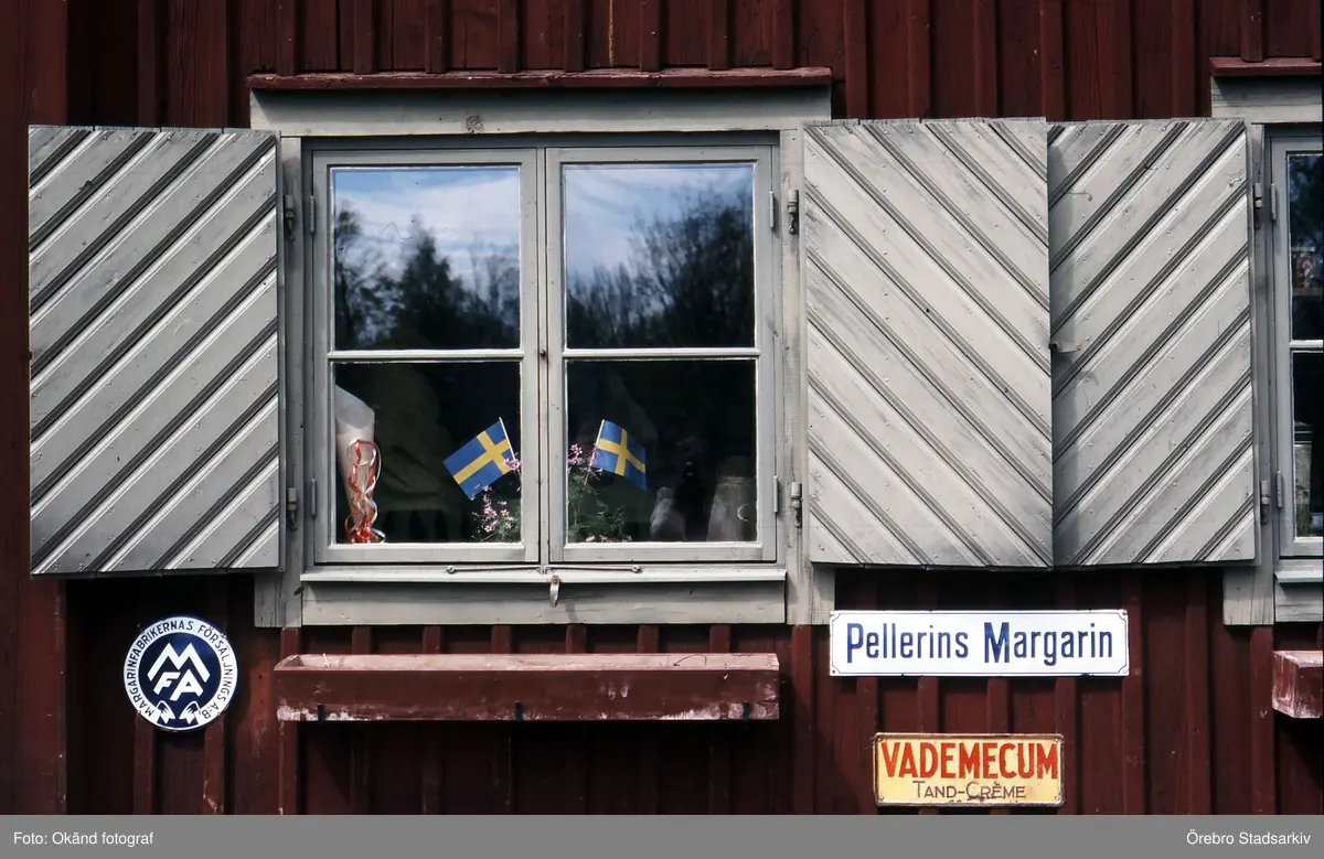 Reklamskyltar på väggen till handelsboden i Wadköping, 1986