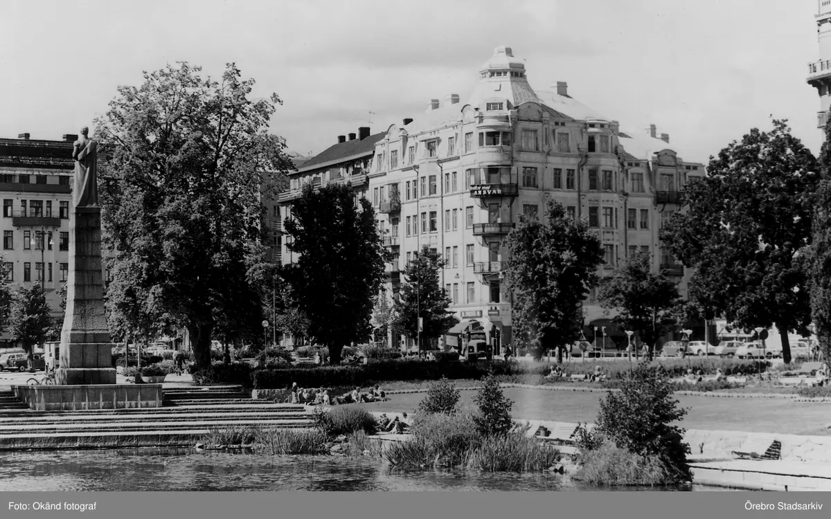 Centralparken och Carl XIV Johan-statyn syns från Örebro slott, 1970-tal