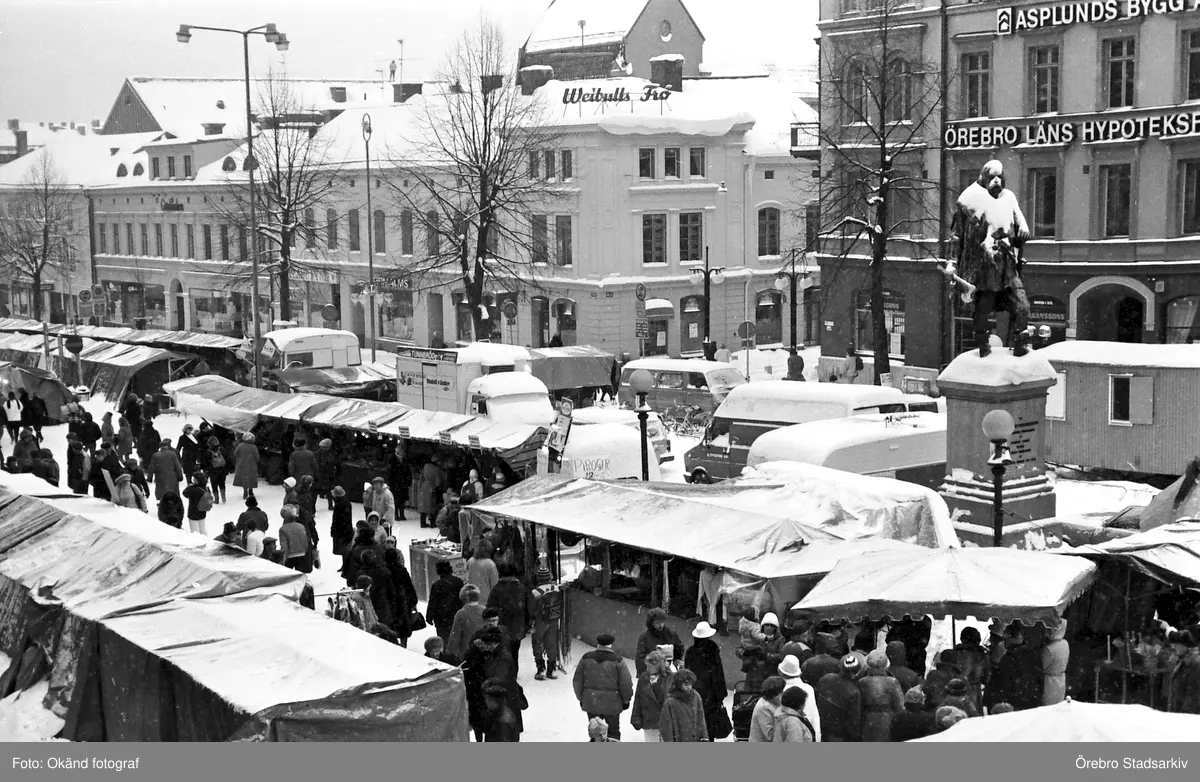 Snön ligger både på Engelbrektsstatyn och på marknadsståndens tak på Hindersmässan, 1985