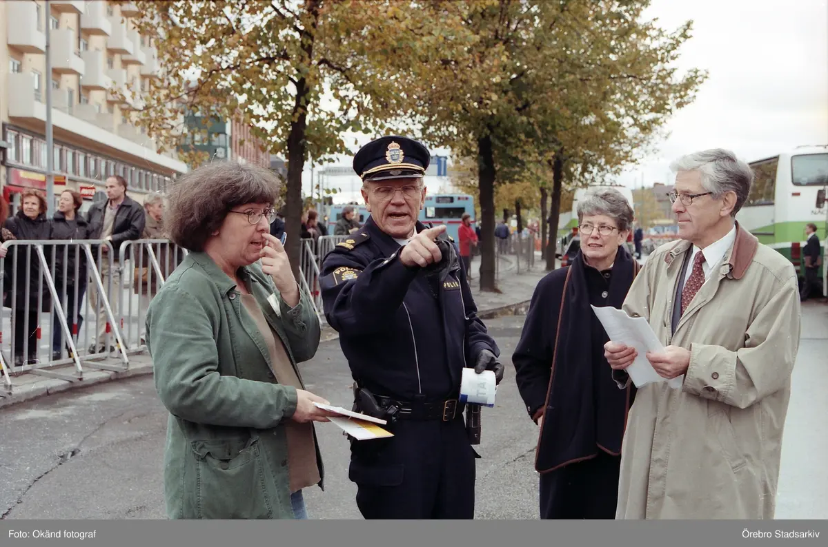 Polisinspektör Hasse Svensson visar vägen för media vid invigning av Mälarbanan, 1997-10-13