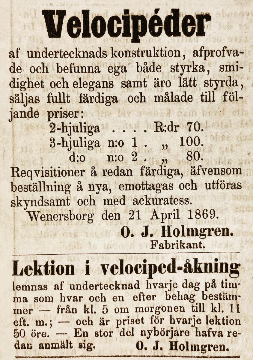 Velocipéder. Ur Tidning för Wenersborgs stad och län. 1869-06-04