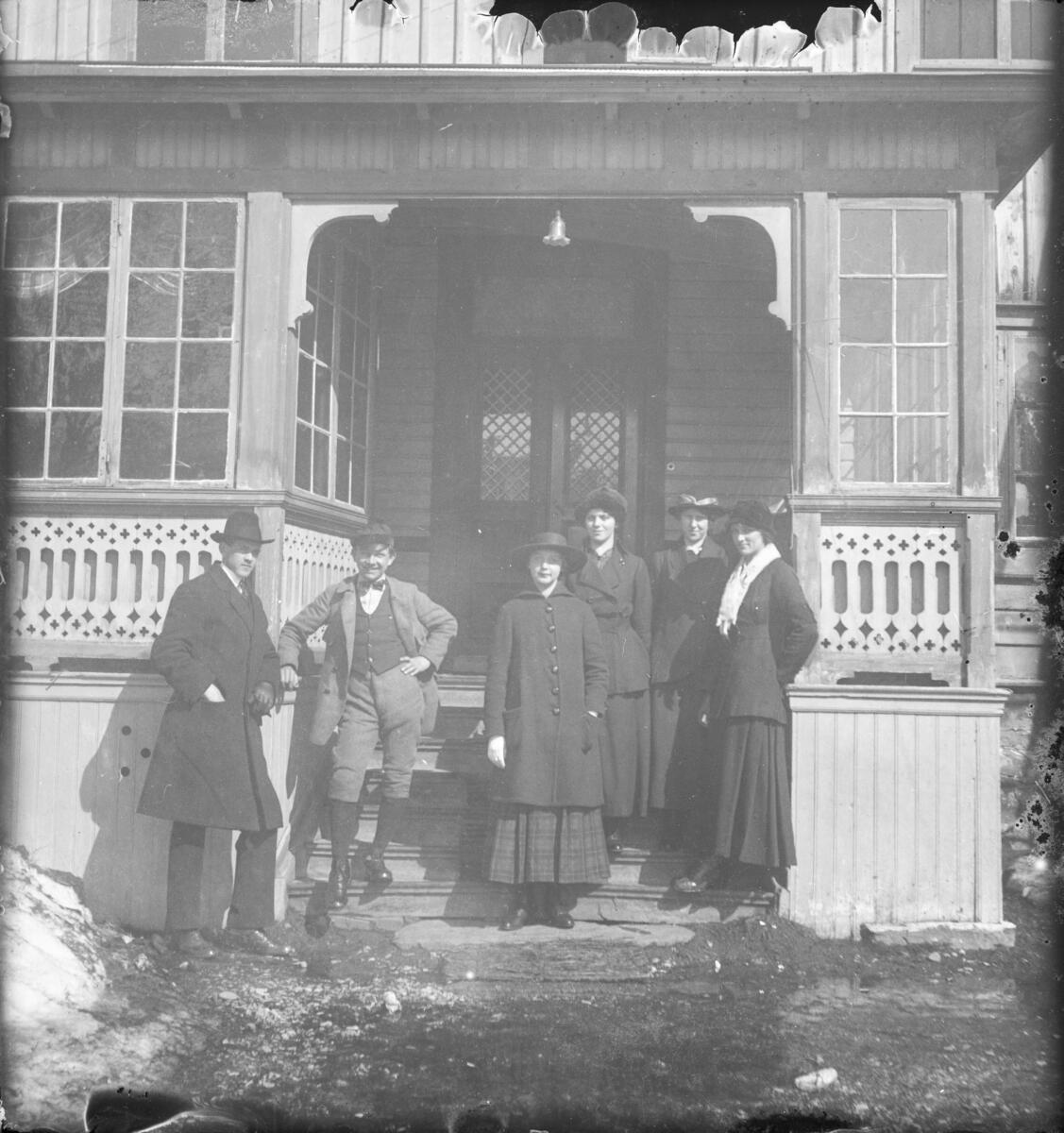 "Grupp 1. Agda, Signe A. Ingeborg, A. Martinsson, Ejnar och Figge. 1/10 s. f. 11. 13.00. Förstärkt sol. 24/4 1916. Agfa." Gruppbild, personer stående utomhus på trappa framför ett bostadshus.