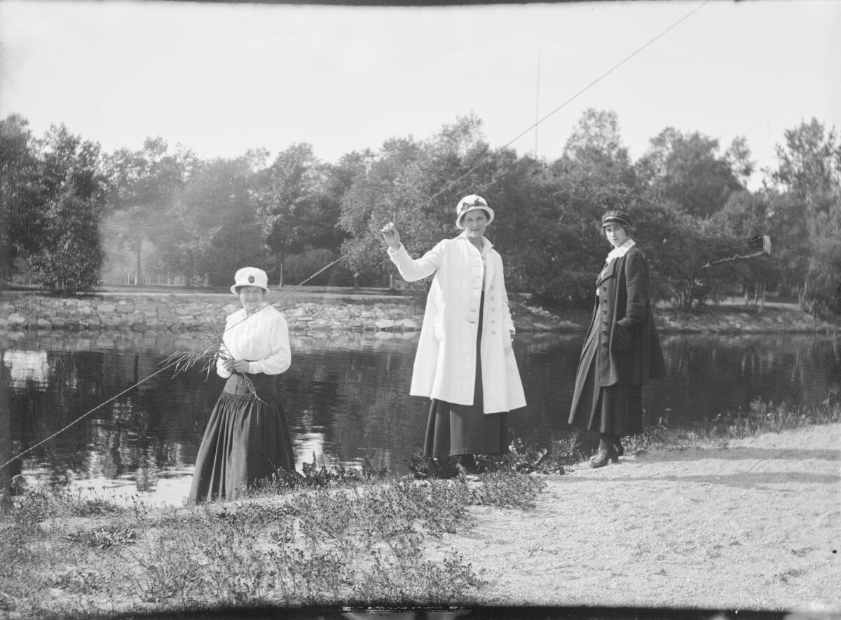 "Anny, Agda och Anna Bodén på kanalbanken. 1/25 s, f. 11. 11/8 1916, 17:00,, sol. Stölma."