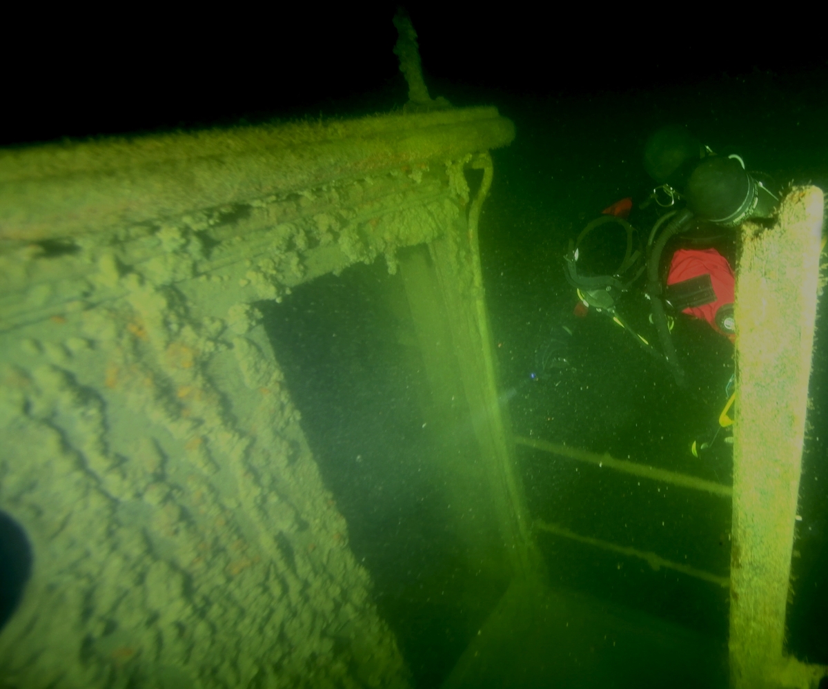 Patrik Höglund tittar in i övre delen ”bygget”/styrhytten på Vestas babordssida.