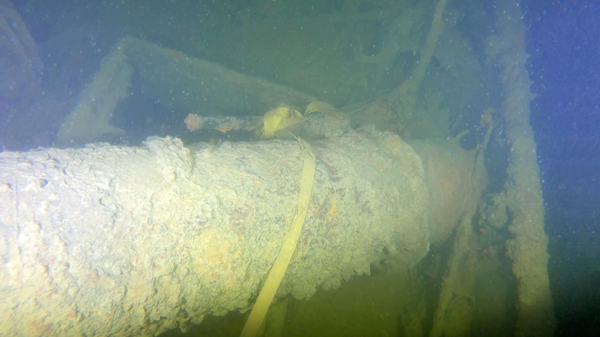 Avbrutet rör eller mindre skorsten på Vesta med spännband från bärgningsförsök eller förtöjningar i fartygslämningen