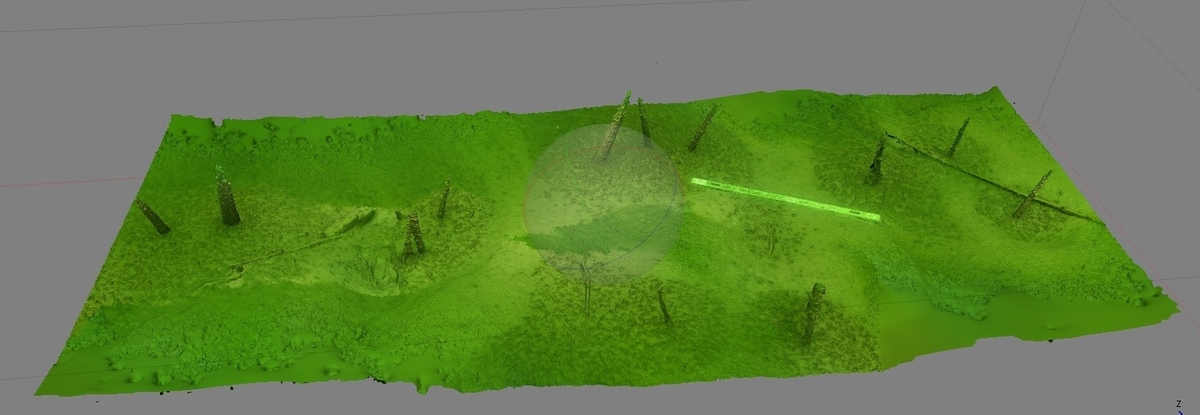 3D-fotogrammetri av en cirka 3m bred och 8 meter långt tvärsnitt av pålanläggning L2023:1862 i Byholmssundet.