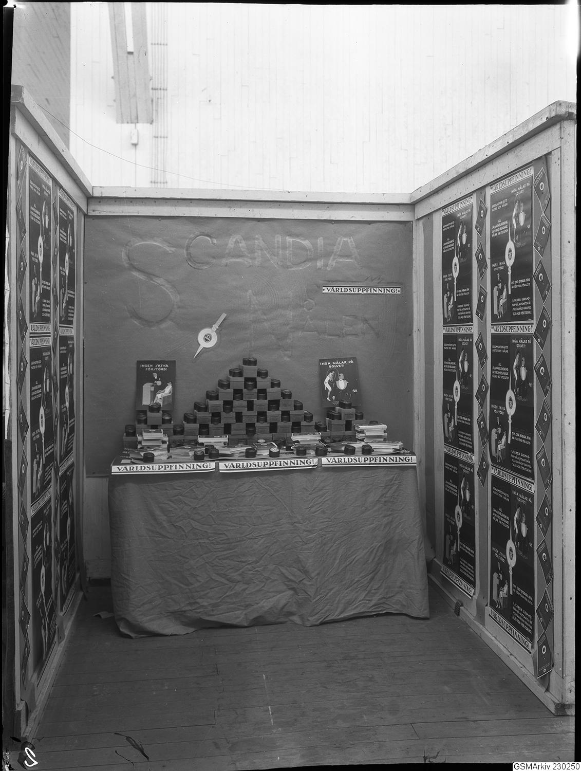 Utställningsdel på Svenska Mässan, monter för Scandianålen, grammofonstift till vevgrammofon