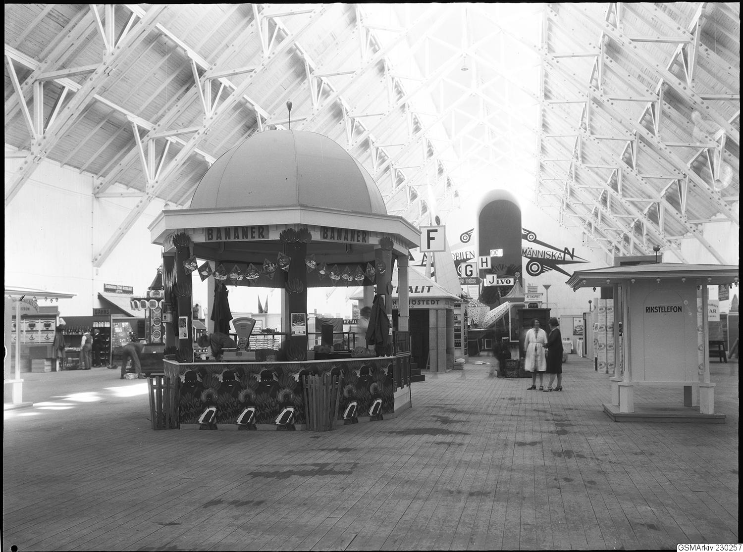 Översiktsbild från utställningshallen på Svenska Mässan, närmast i bilden, kiosk med Jamaica bananer. Längre in i mässhällen syns utställniingen om Människan och Automobilen.