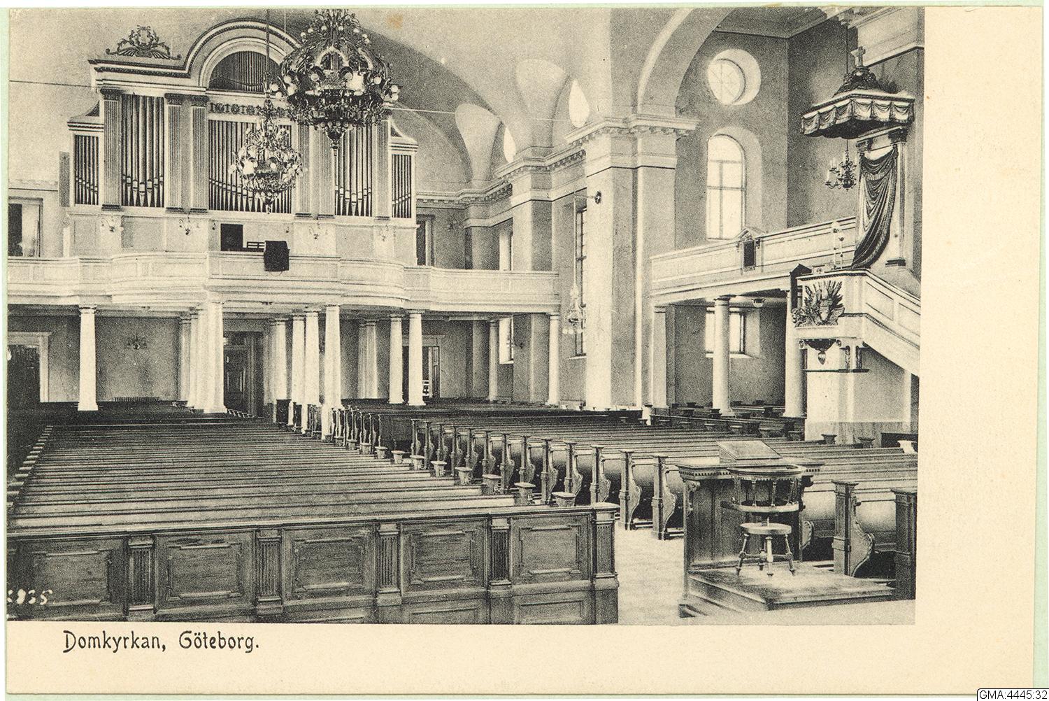 Interiör från Göteborgs Domkyrka, blick mot orgelläktaren i väster.