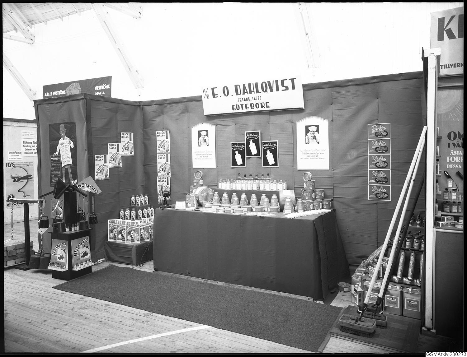 Monter på Svenska Mässan, för E. O. Dahlqvist, Göteborg, återförsäljare för Sebril hälsodryck, Åtvidaberg bonvax och möbelpolish och Pedix insektsmedel.
