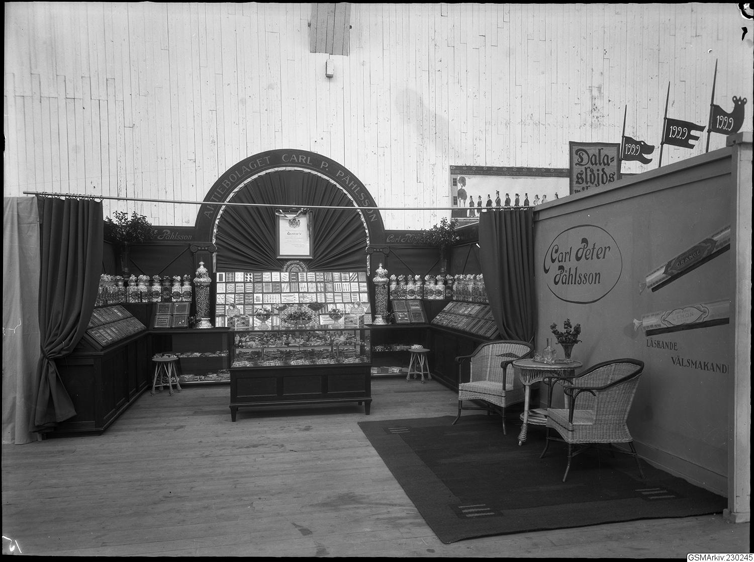 Utställningsdel på Svenska Mässan, Carl P Påhlssons monter, med choklad bland annat.