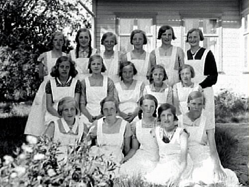 Skolklass. Gruppbild på skolköksflickor. Flickorna är klädda i ljusa förkläden och huvuddukar. Bilden är tagen utomhus.