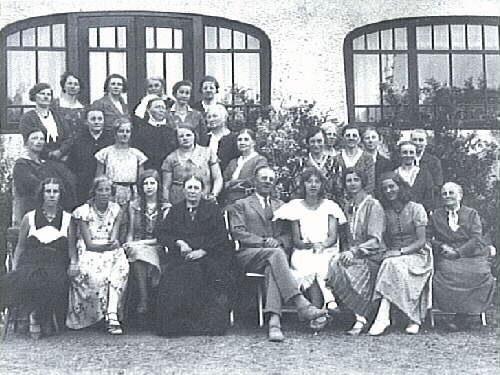 Fru (Julia) Wegners födelsedagsgrupp. En grupp kvinnor och män fotograferade utomhus vid en husfasad.